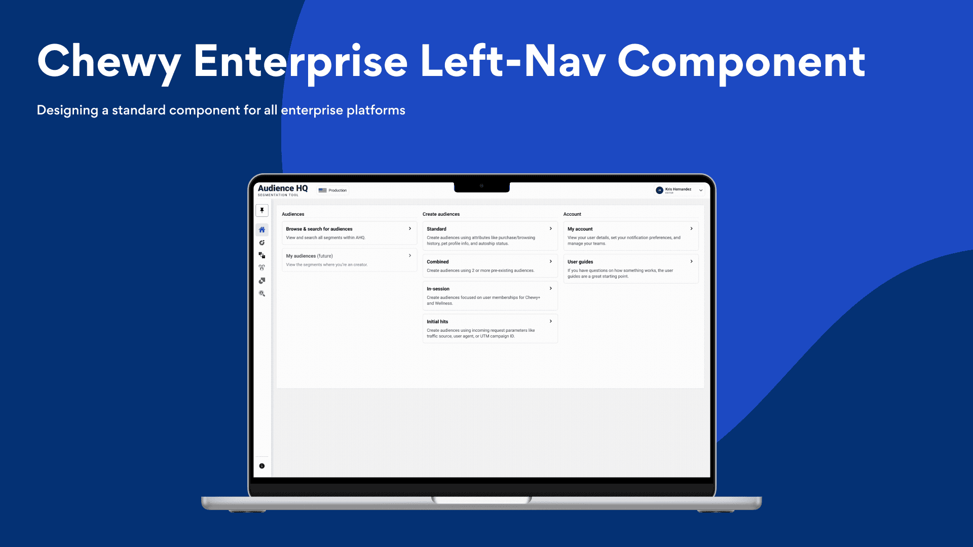 Chirp, Chewy’s design system, lacked a standardized left-navigation component for the enterprise platforms, leading to inconsistent navigation design and patterns across platforms. This resulted in inconsistent user experiences, duplicated efforts from design and engineering teams, and increased maintenance costs.